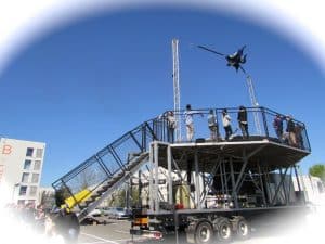 Ma soufflerie mobile accueille en son centre 2 hélices à rotation contre rotative de 2,3 mètres entraînées par un moteur de 700 CV. Elle produit un flux d’air de 250 km/h. Ce qui équivaut à la vitesse d’une chute libre.